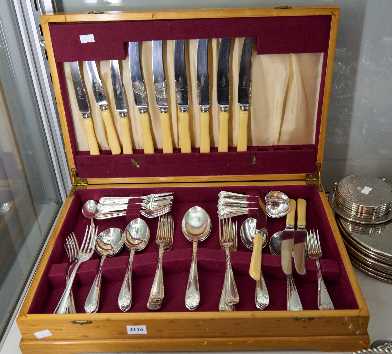 1920S CASED ENGLISH SILVER PLATE CUTLERY SET FOR SIX (44 PC), LEONARD JOEL LOCAL DELIVERY SIZE: MEDIUM