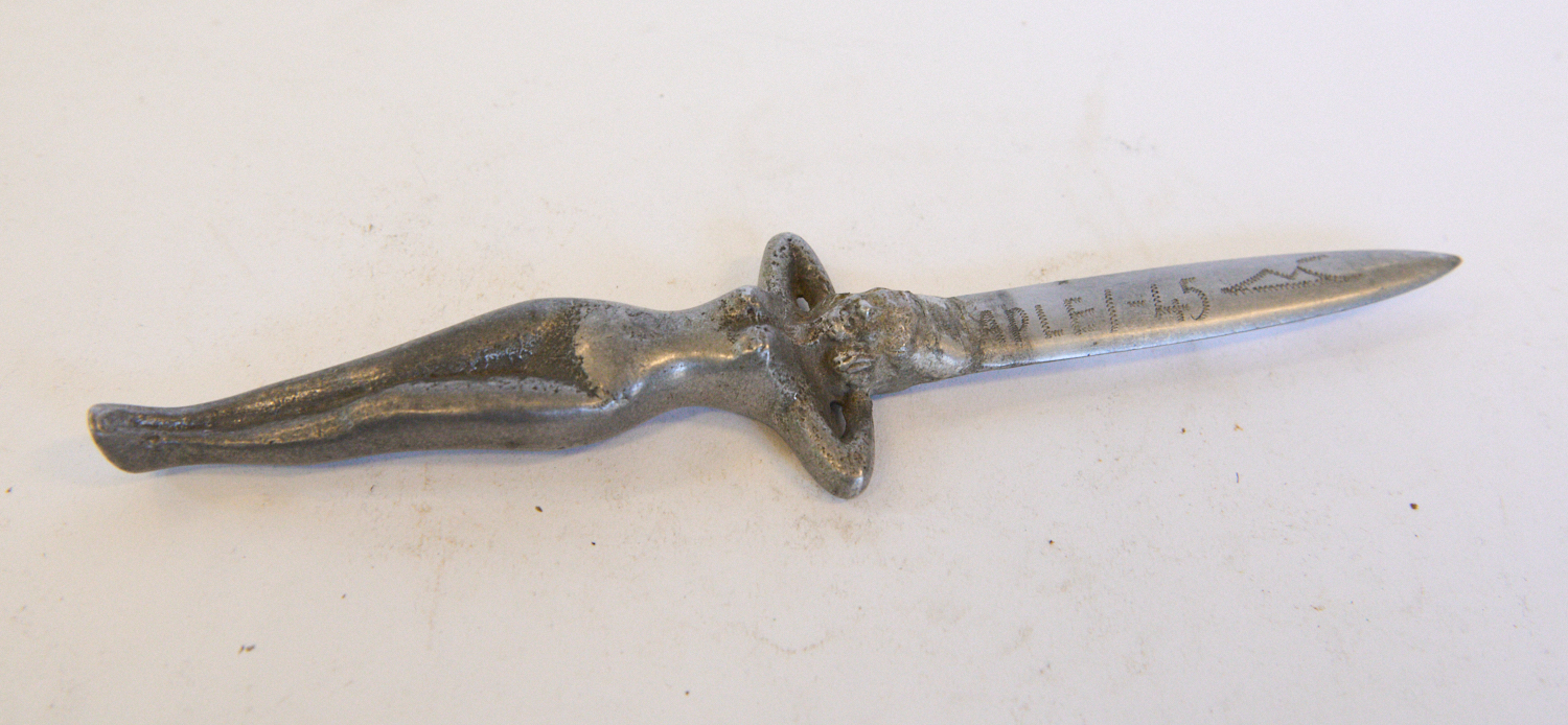 WWII ITALIAN SOUVENIR ALUMINIUM PAPER KNIFE IN THE FORM OF A NAKED LADY ENGRAVED NAPLES 1945 TO BLADE L.26CM, LEONARD JOEL LOCAL DELIVERY SIZE: SMALL