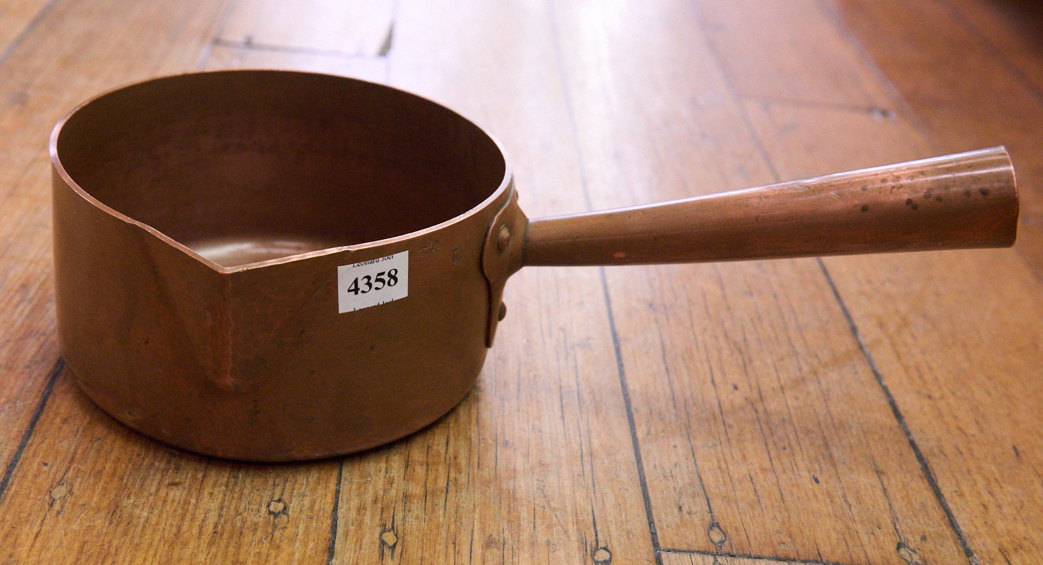 A COPPER HAND BEATEN SAUCEPAN WITH GLASS FORM MAKERS STAMP, LEONARD JOEL LOCAL DELIVERY SIZE: SMALL