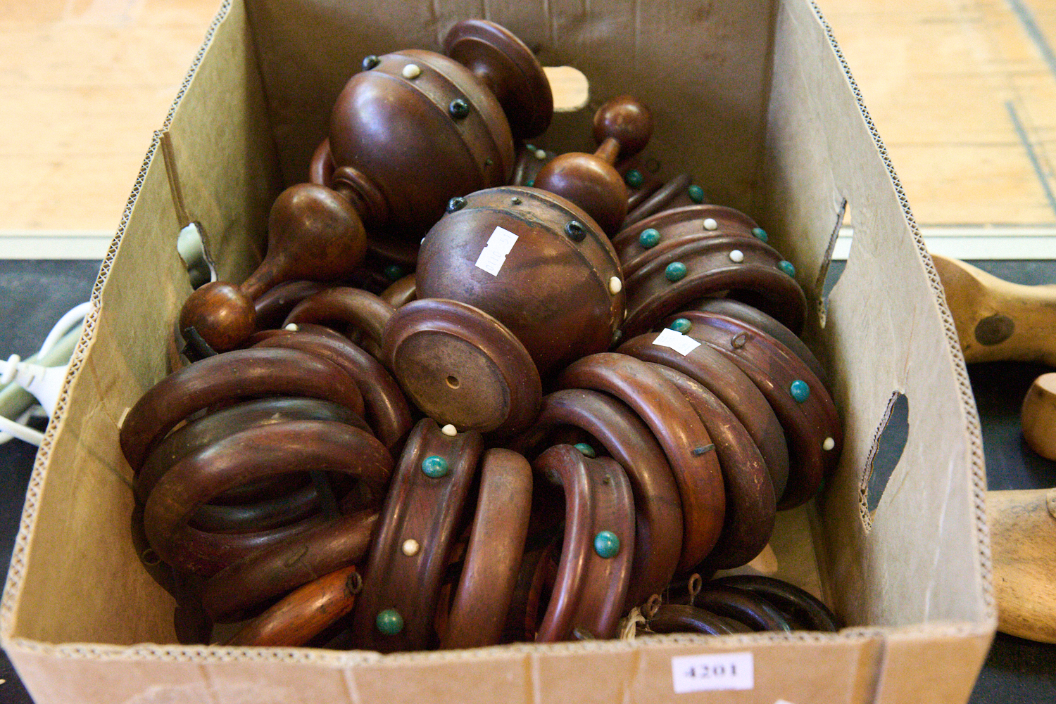 LARGE COLLECTION OF VICTORIAN HUON PINE AND CEDAR CURTAIN RINGS AND ENDS ADORNED WITH CERAMIC BEADS, LEONARD JOEL LOCAL DELIVERY SIZE: MEDIUM