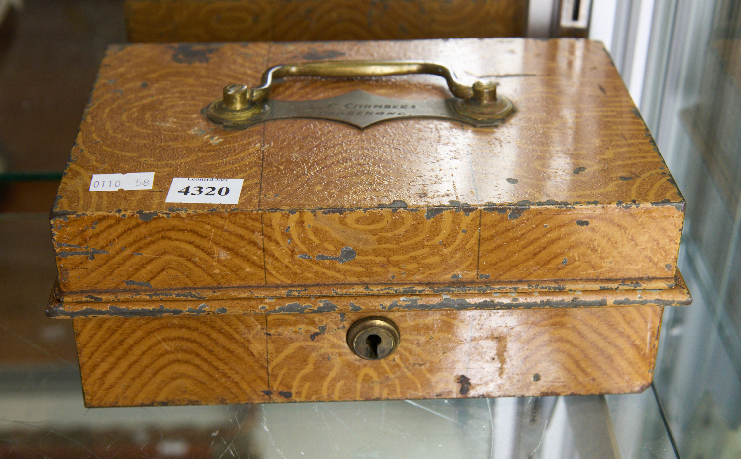 A 20TH C FAUX BOIS CASH TIN WITH BRASS HANDLE AND KEY AND INTERNAL TRAY W.22CM X H.9CM X D.15.5CM, LEONARD JOEL LOCAL DELIVERY SIZE: SMALL