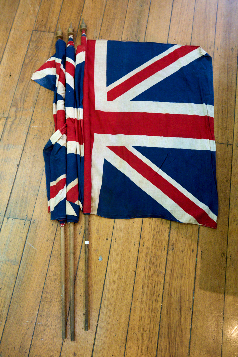 THREE UNION JACK FLAGS ON POLES H.141CM, LEONARD JOEL LOCAL DELIVERY SIZE: MEDIUM