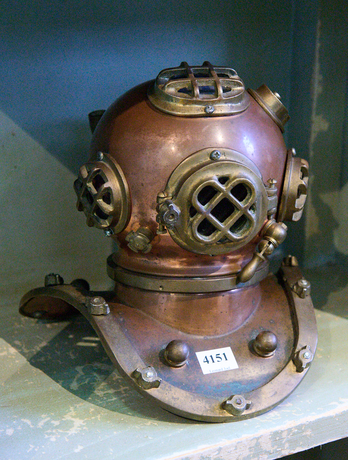 A VINTAGE MINIATURE COPPER AND BRASS DIVERS HELMET H.23CM, LEONARD JOEL LOCAL DELIVERY SIZE: SMALL