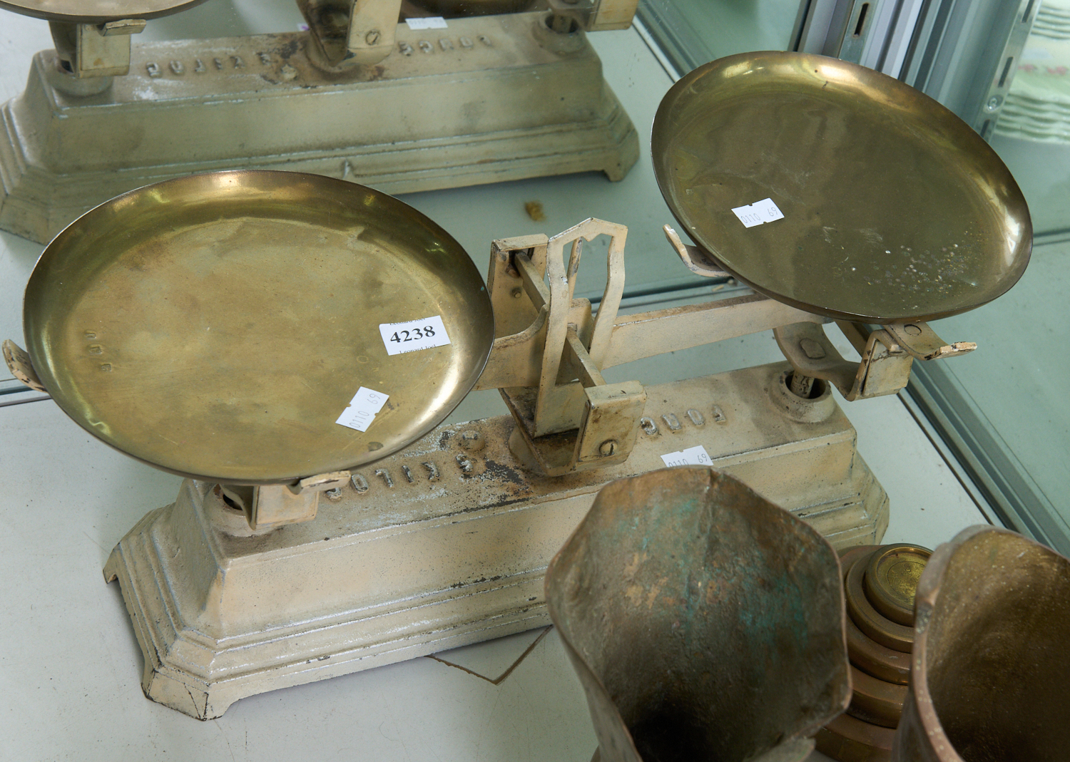 A 20TH C CAST IRON SET OF SCALES TOGETHER WITH WEIGHTS W.36CM, LEONARD JOEL LOCAL DELIVERY SIZE: MEDIUM