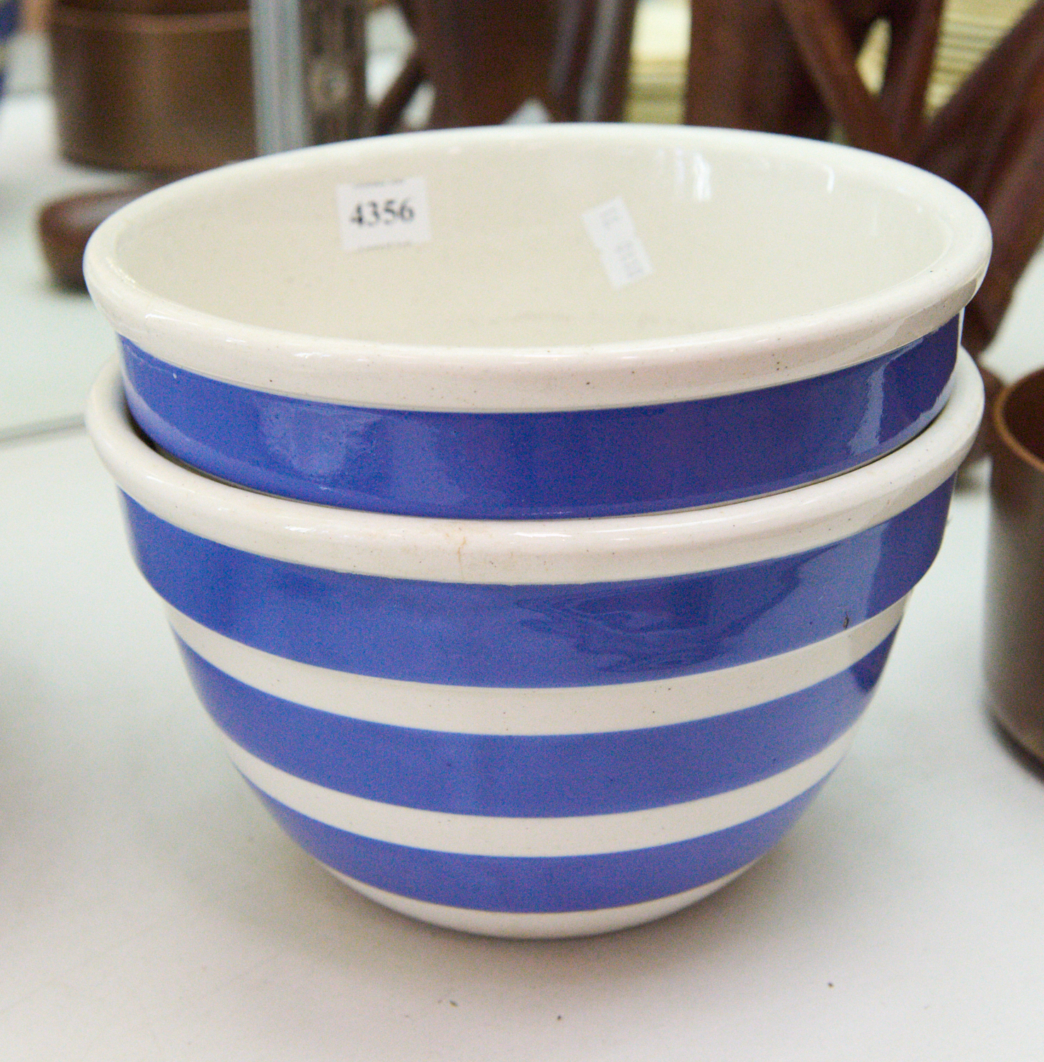 PAIR OF EARLY AUSTRALIAN BLUE AND WHITE STRIPED R FOWLER MIXING BOWLS DIA.20CM, H.13CM, LEONARD JOEL LOCAL DELIVERY SIZE: SMALL