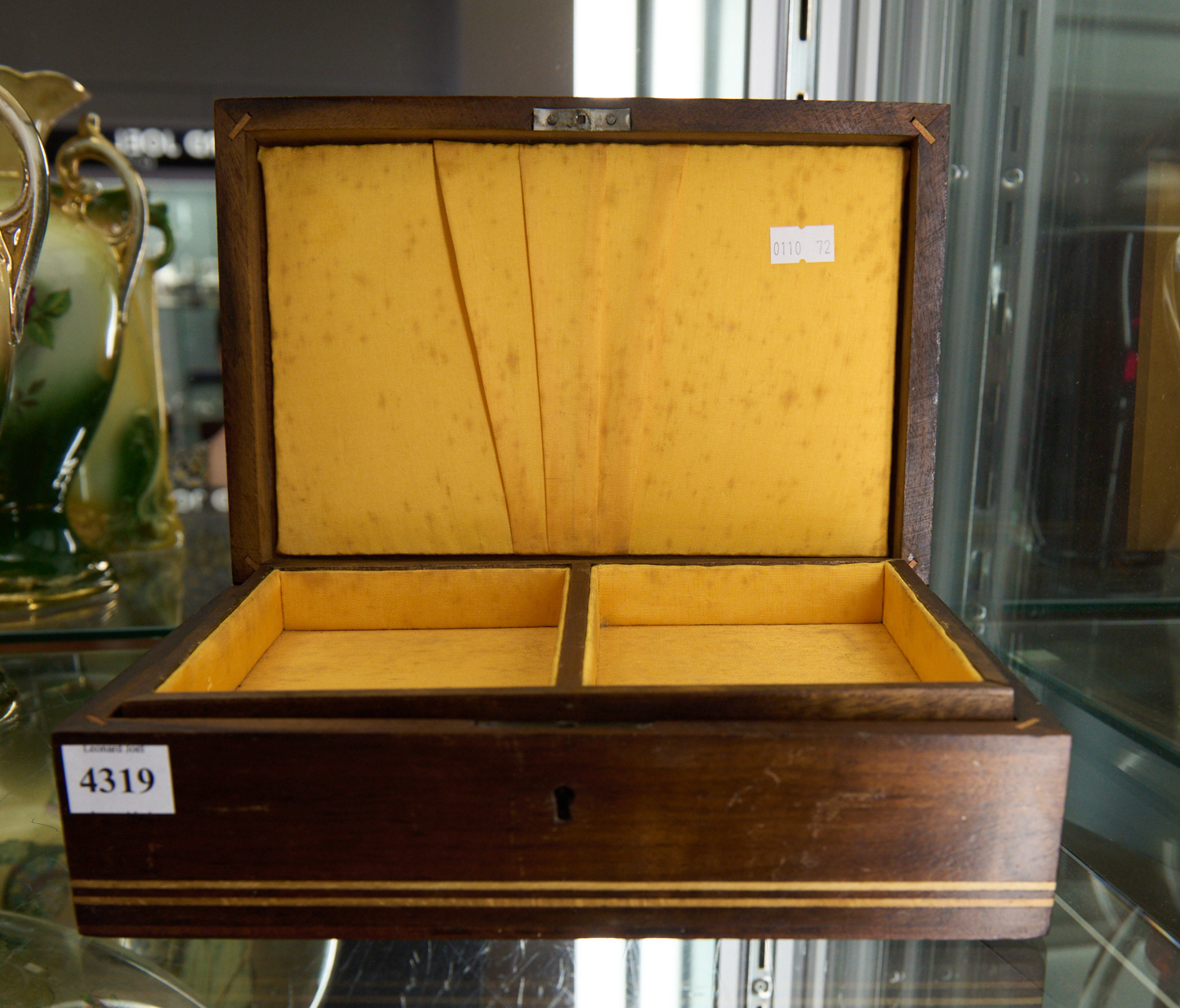 A FLOWER MOTIF INLAID WOODEN JEWELLERY BOX, SILK LINED WITH INTERNAL REMOVABLE SHELF W.24CM X D.16CM X H.8CM, LEONARD JOEL LOCAL DELIVERY SIZE: SMALL