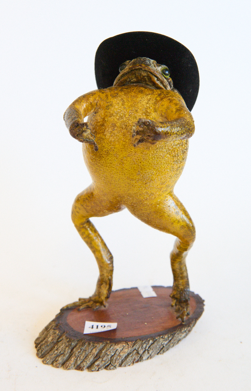 AN UNUSUAL TAXIDERMY STANDING CANE TOAD WITH FELT AKUBRA FORM HAT H.26CM, LEONARD JOEL LOCAL DELIVERY SIZE: SMALL