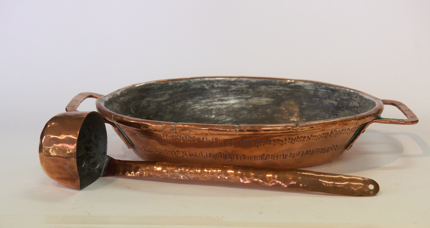 A HAND HAMMERED OVAL COPPER SERVING DISH AND MATCHED LADLE W.39CM, LEONARD JOEL LOCAL DELIVERY SIZE: SMALL