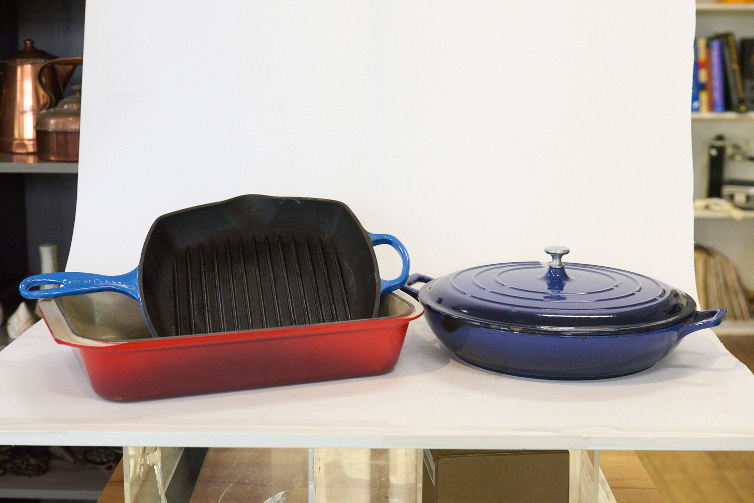A GROUP CAST IRON AND ENAMEL COOK WARE INCLUDING TWO FRENCH LE CREUSET AND UNBRANDED FRENCH LIDDED POT, LEONARD JOEL LOCAL DELIVERY SIZE: MEDIUM
