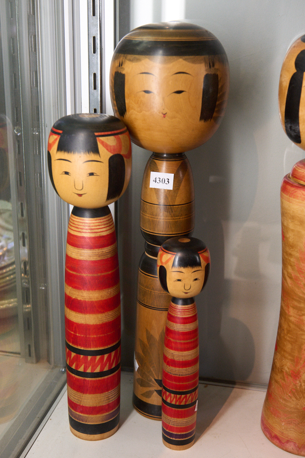 THREE HAND PAINTED JAPANESE WOODEN KOKESHI DOLLS, LEONARD JOEL LOCAL DELIVERY SIZE: SMALL