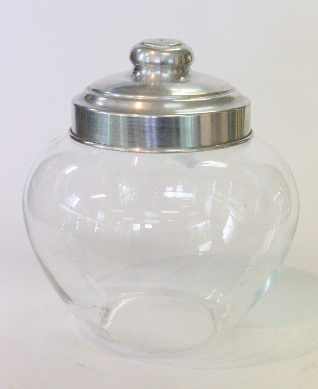 A GLASS AND ALUMINIUM BISCUIT BARREL H.23.5CM, LEONARD JOEL LOCAL DELIVERY SIZE: SMALL