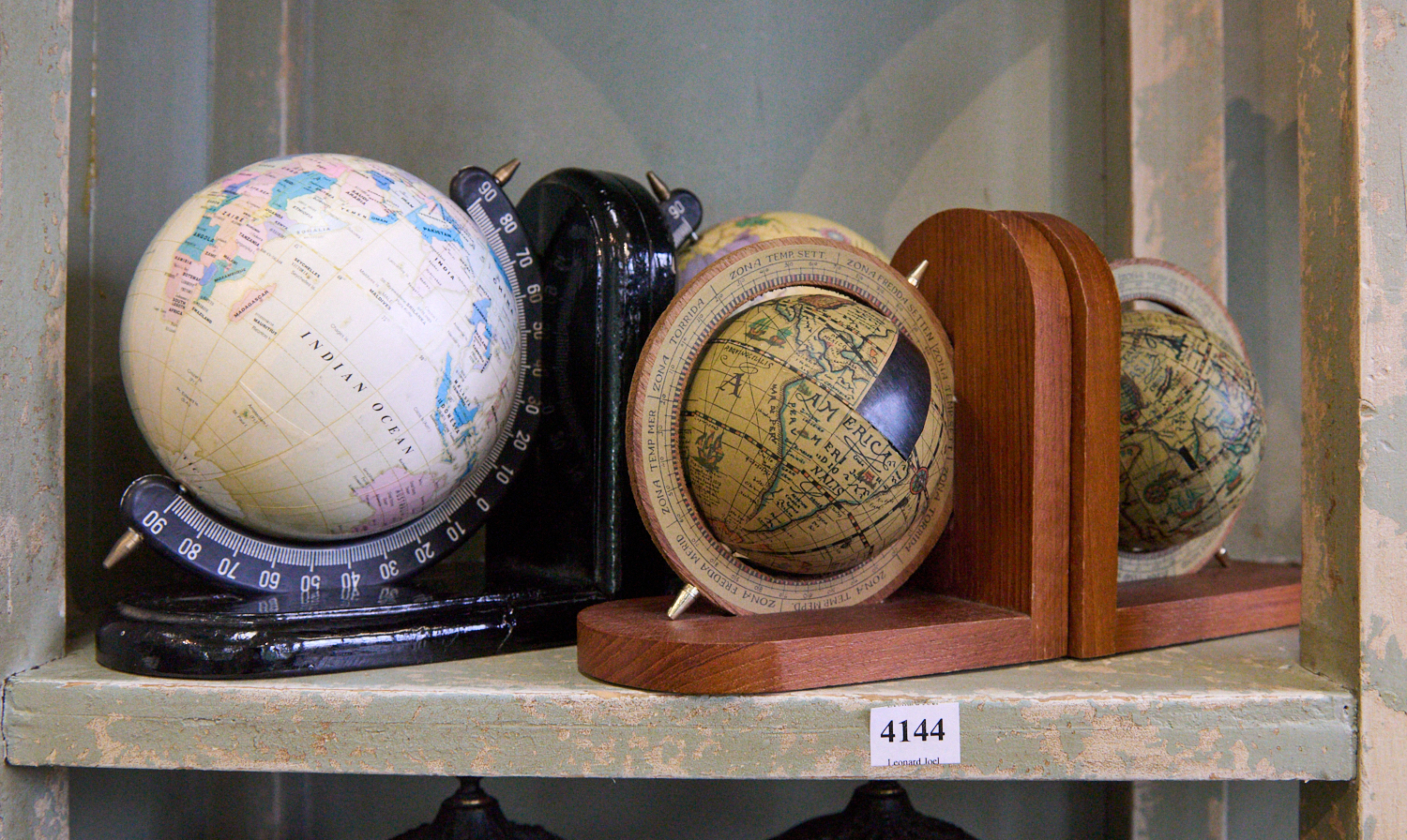 TWO PAIRS OF WOODEN ENDED WORLD GLOBE BOOKENDS H.15CM, LEONARD JOEL LOCAL DELIVERY SIZE: MEDIUM