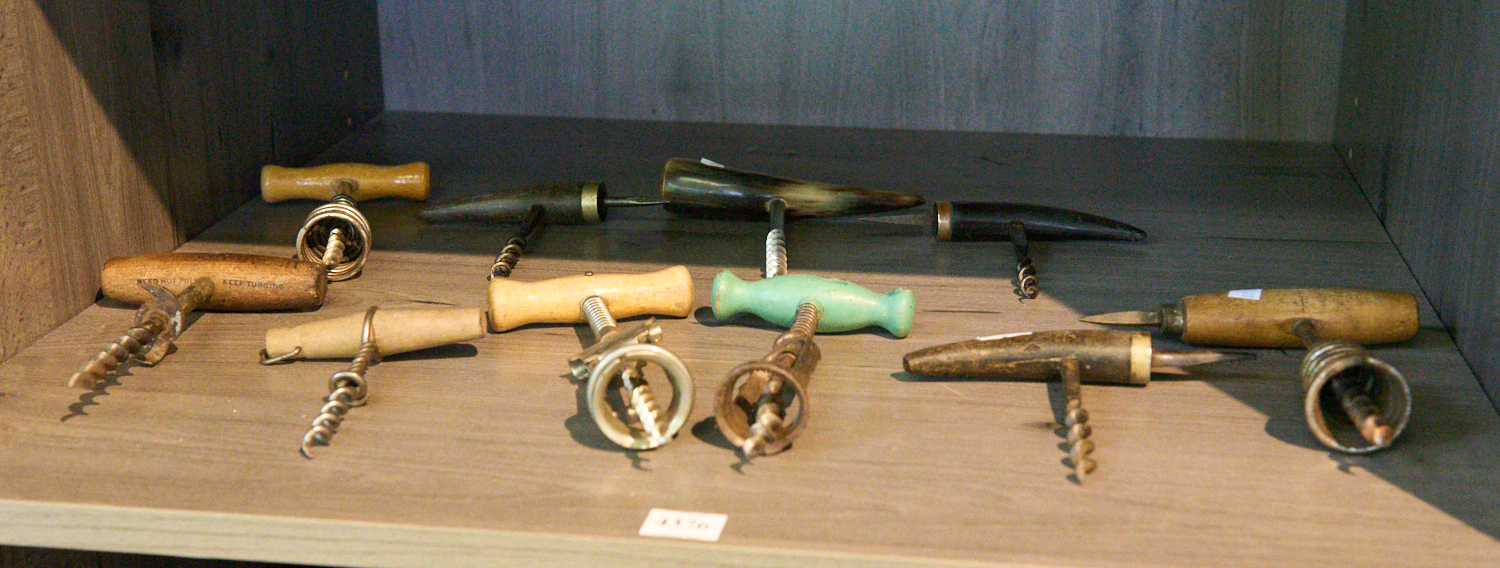 A COLLECTION OF ANTIQUE AND VINTAGE CORKSCREWS INCLUDING 4 HORN HANDLED AND 6 WOODEN HANDLED, LEONARD JOEL LOCAL DELIVERY SIZE: SMALL