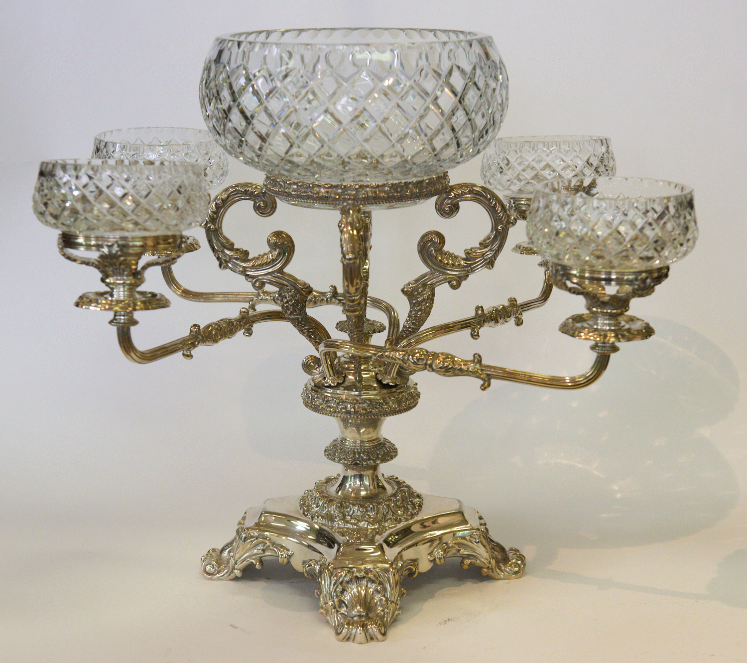 A SILVER PLATE FIVE BOWL CENTRE SERVING EPERGNE WITH MATCHED CUT CRYSTAL BOWLS H.44CM, LEONARD JOEL LOCAL DELIVERY SIZE: MEDIUM