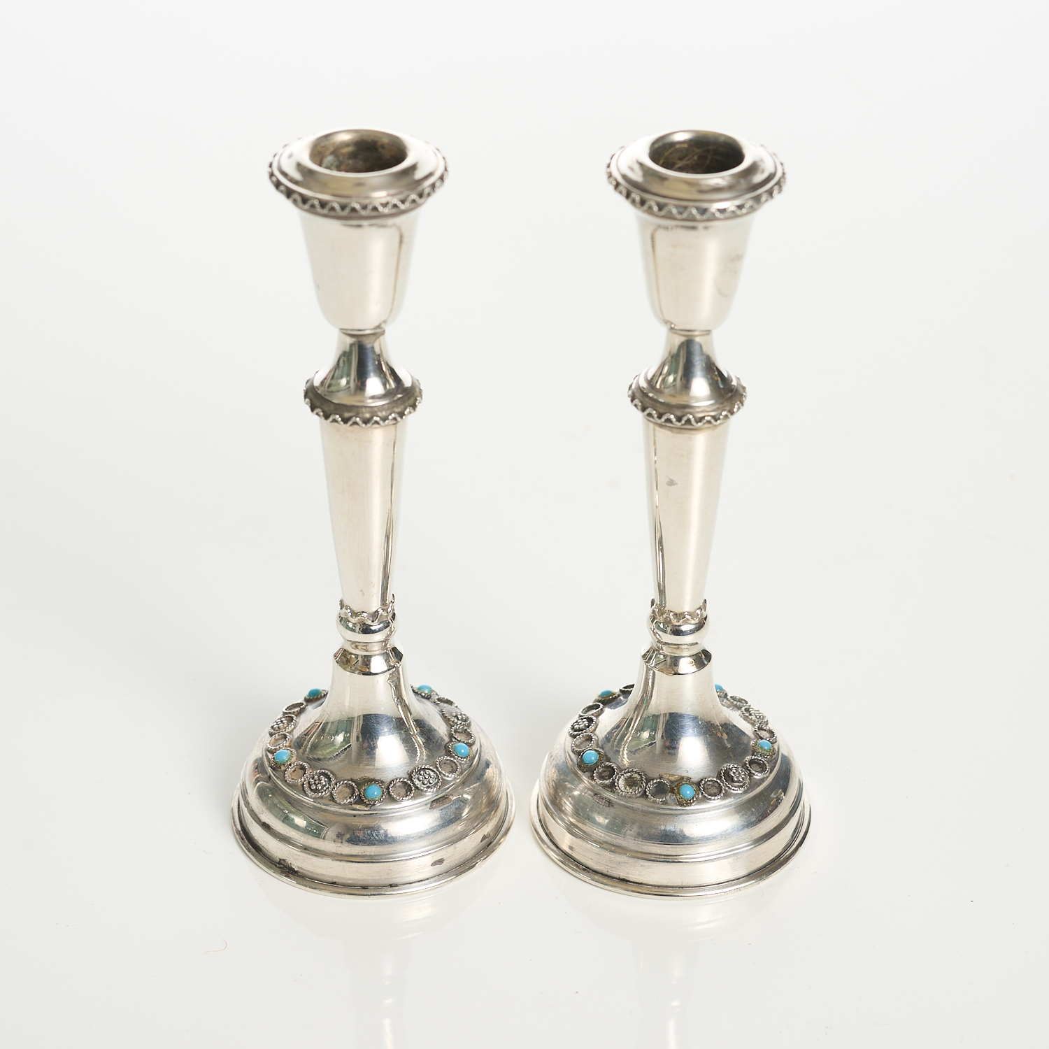 A PAIR OF JEWISH STERLING SILVER CANDLESTICKS WITH TURQUOISE BEADS H.13.5CM, LEONARD JOEL LOCAL DELIVERY SIZE: SMALL