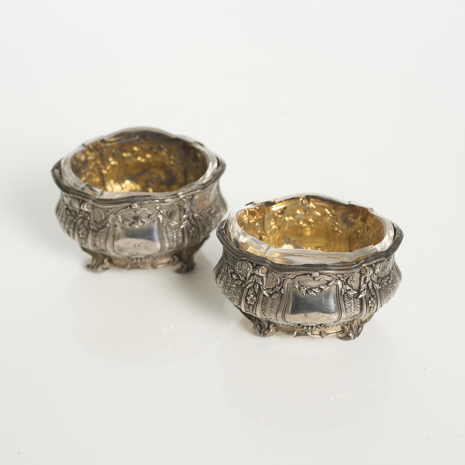 A PAIR OF FRENCH SILVER FLORAL DECORATED SALTS WITH GLASS LINERS, LEONARD JOEL LOCAL DELIVERY SIZE: SMALL