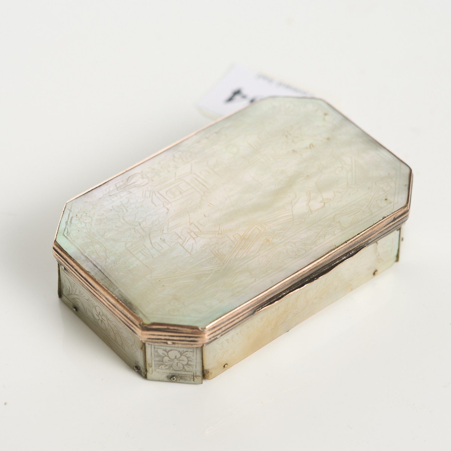 A MOTHER OF PEARL ENGRAVED SNUFF BOX - CHINESE SCENES H.1.5CM X 6.5CM X D.4CM, LEONARD JOEL LOCAL DELIVERY SIZE: SMALL