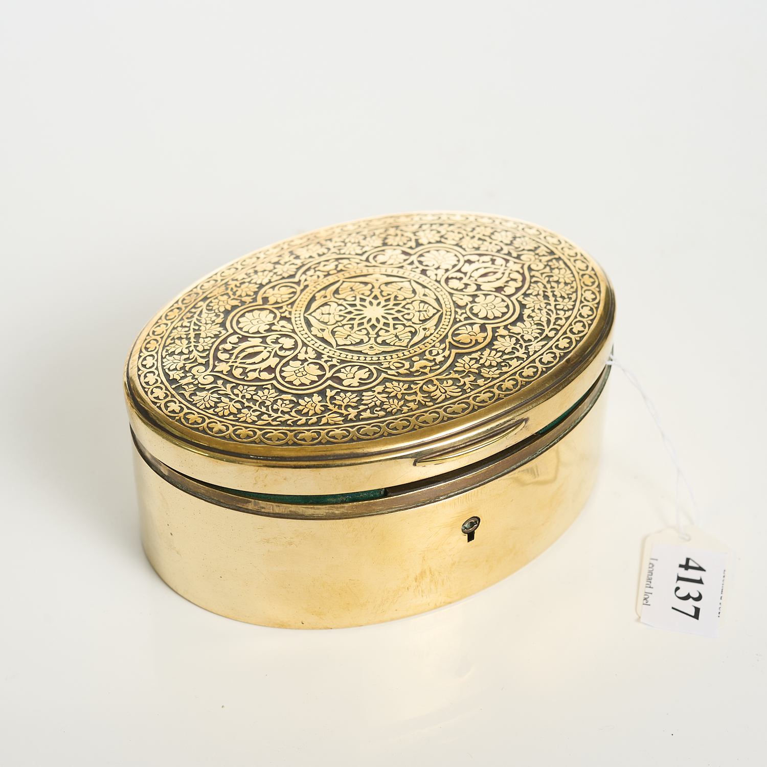 A 20TH C BRASS ENGRAVED AND ENAMELLED TOPPED JEWELERY CASKET W.11.5CM, LEONARD JOEL LOCAL DELIVERY SIZE: SMALL