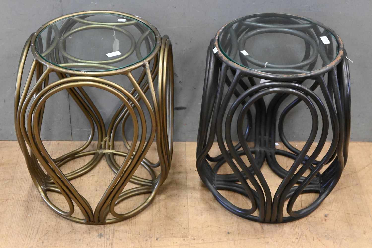 TWO DECORATIVE METAL DRUM SIDE TABLES WITH GLASS TOPS (A/F) (51H x 40D CM) (LEONARD JOEL DELIVERY SIZE: LARGE)