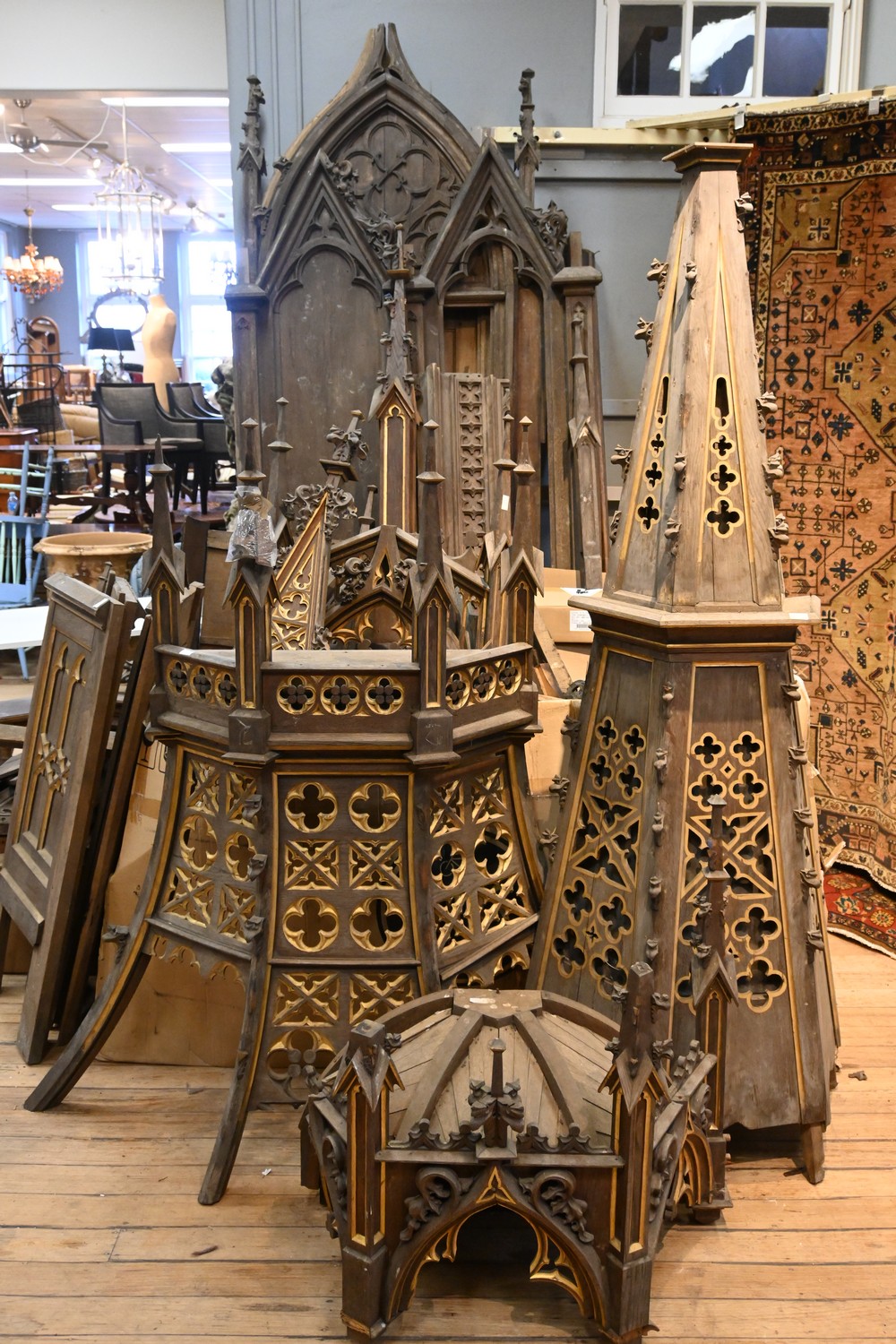 A LARGE COLLECTION OF CARVED TIMBER PANELS AND SPIRES FROM A CHURCH (A/F) (PLEASE NOTE THIS HEAVY ITEM MUST BE REMOVED BY CARRIERS AT THE CUSTOMER'S EXPENSE. LEONARD JOEL STAFF CANNOT ASSIST CARRYING THIS ITEM) (X-LARGE ITEM)