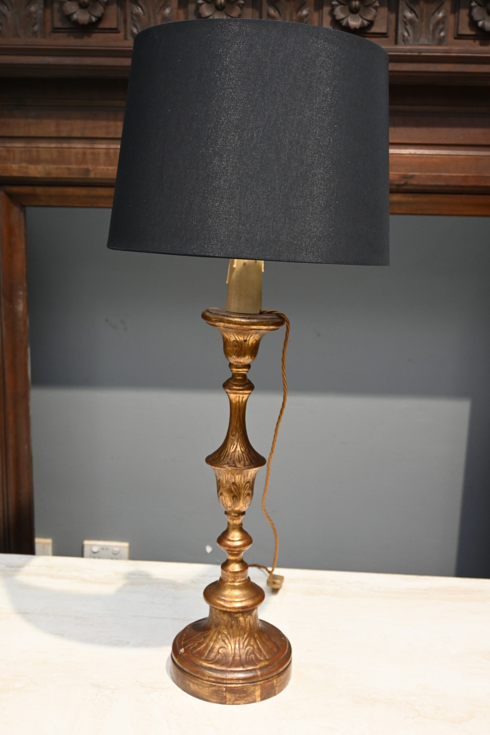 A FULLY RESTORED FRENCH 19TH CENTURY WATER GILDED LAMP & SHADE (A/F) (89H CM) (LEONARD JOEL DELIVERY SIZE: LARGE)
