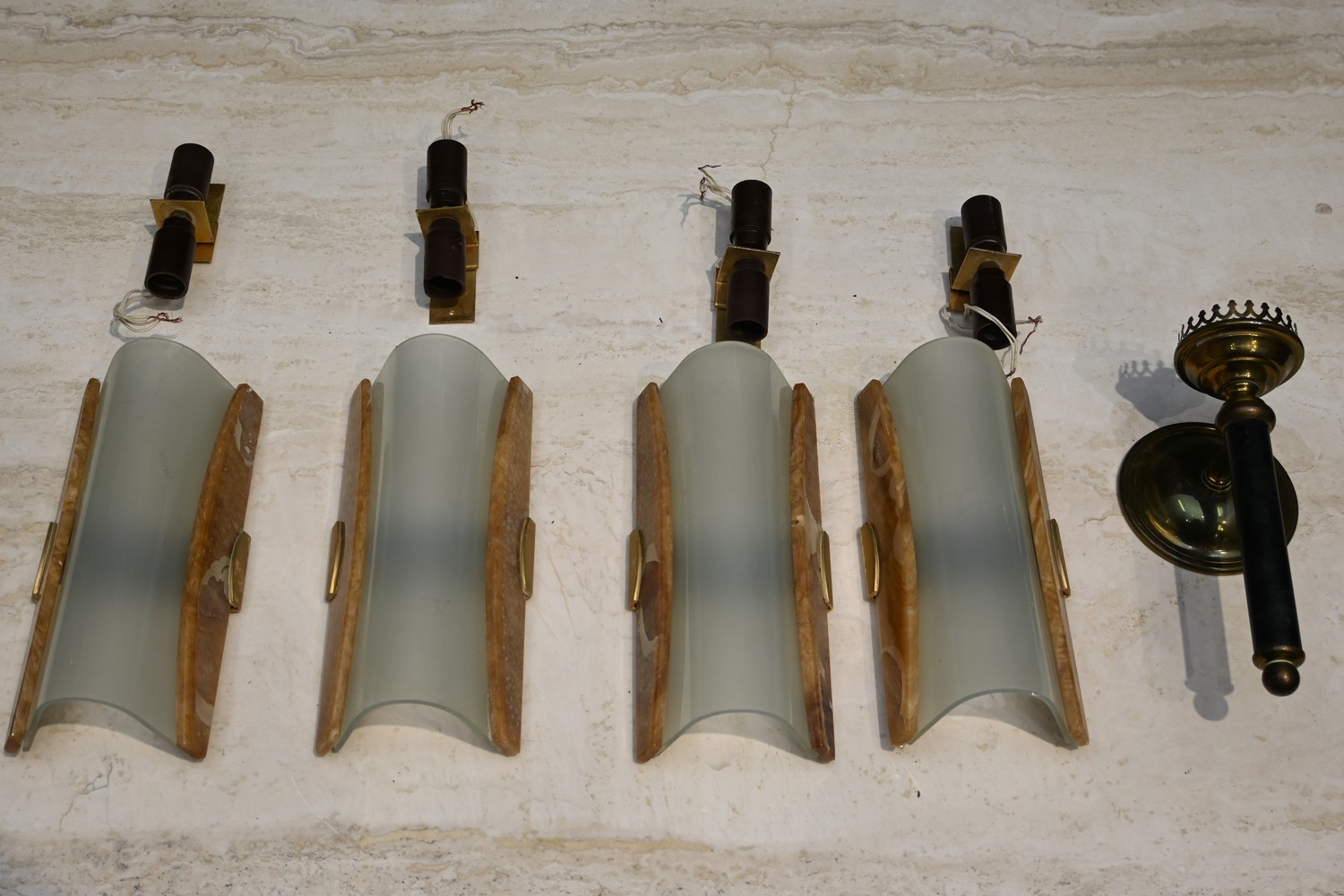 SET OF 4 MID CENTURY ITALIAN ONYX & GLASS WALL SCONCES, C.1970'S (A/F) (25H x 11W CM) (LEONARD JOEL DELIVERY SIZE: MEDIUM)