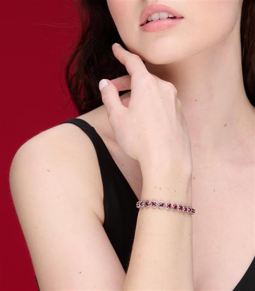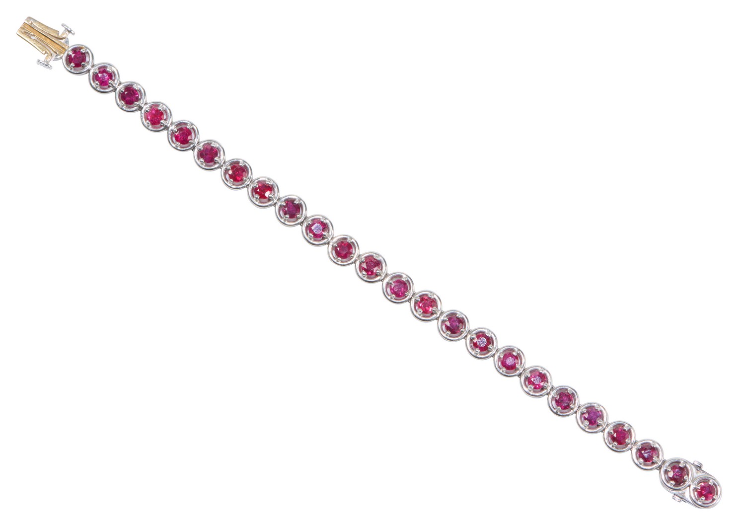 A RUBY BRACELET IN PLATINUM, BY TIFFANY & CO, DESIGNED AS A LINE OF TWENTY-FOUR CLAW-SET CIRCULAR-CUT RUBIES TOGETHER WEIGHING APPROXIMATELY 5.76 CARATS, EACH WITHIN AN OPEN CIRCULAR SETTING, LENGTH 160MM