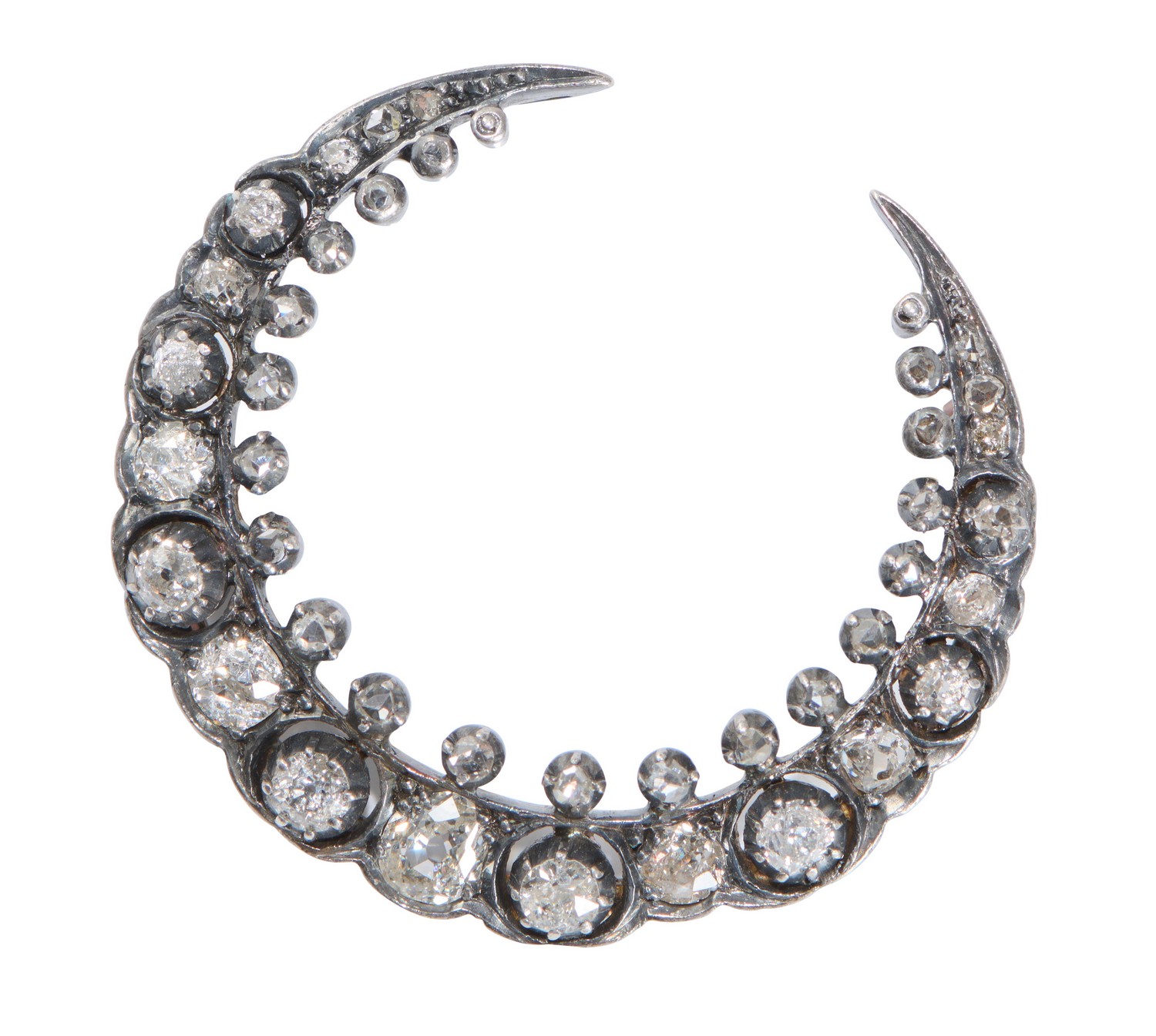 The crescent, set with graduating old European and rose-cut diamonds together weighing approximately 1.20 carats, length 35mm.