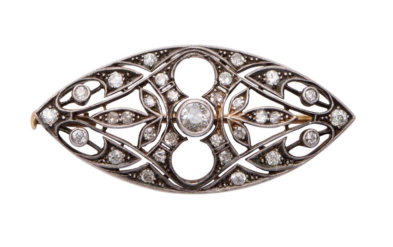 Centring an old European-cut diamond weighing approximately 0.25 carats, within an open surround detailed with old-cut diamonds together weighing approximately 0.60 carats, French marks, length 42mm.