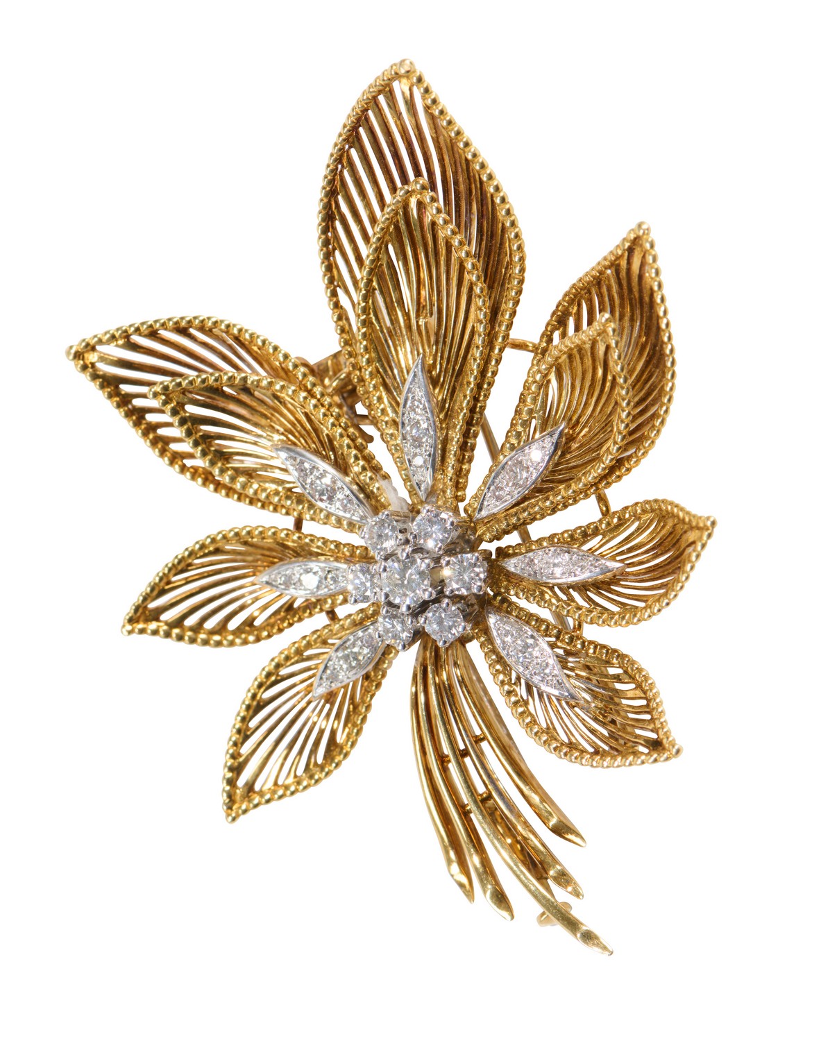 Designed as a stylised flowerhead composed of layered pierced and ropetwist petals, centring a cluster of round brilliant-cut diamonds framed by diamond-set inner petals, the diamonds together weighing approximately 1.00 carat, length 60mm.