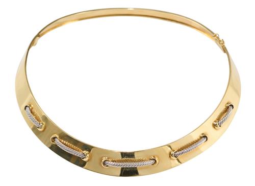 A COLLAR IN TWO-TONE 18CT GOLD BY CARTIER, CIRCA 1970, THE WIDE FLAT POLISHED COLLAR WITH CONTRASTING WHITE GOLD ROPE STYLE LINKS, SIGNED CARTIER AND NUMBERED 54066, LENGTH 380MM
