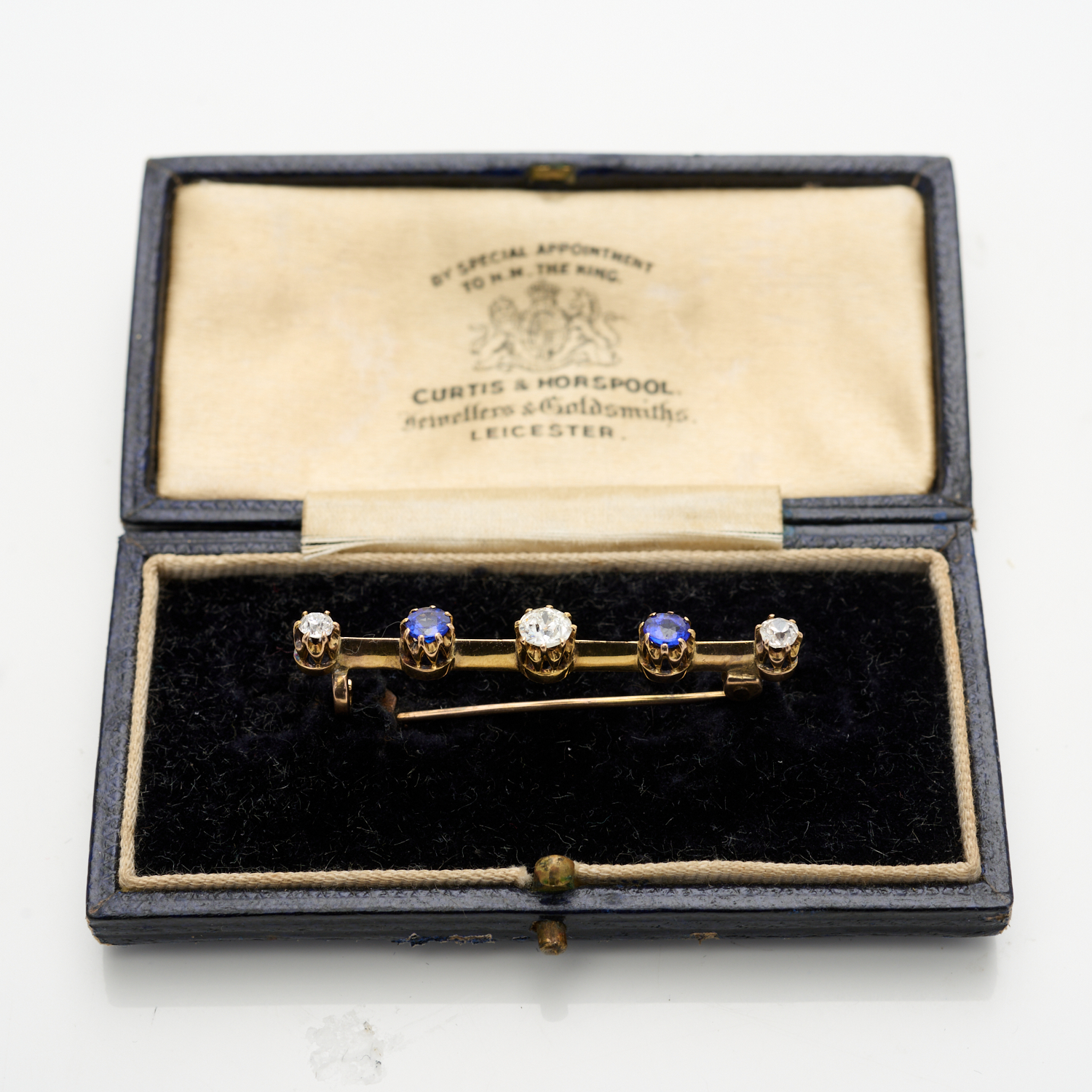A DIAMOND AND BLUE PASTE BAR BROOCH IN 9CT GOLD
