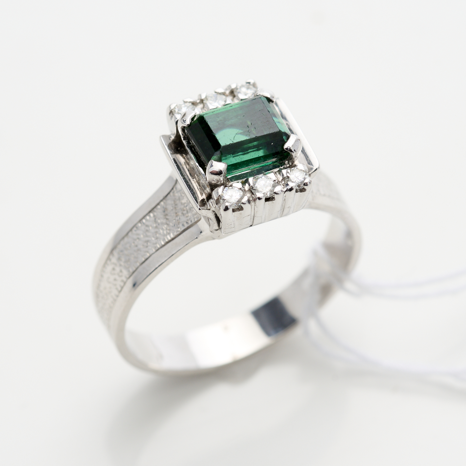 A TOURMALINE AND DIAMOND RING IN 18CT WHITE GOLD AND PALLADIUM, SIZE U, 7.35GMS