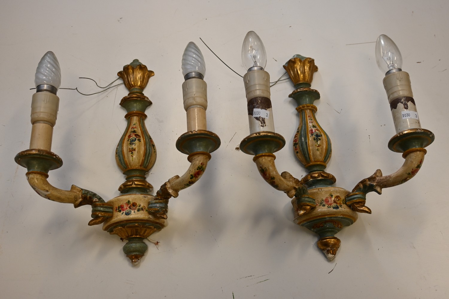 A PAIR OF FRENCH STYLE HAND PAINTED WALL SCONCES (35H x 26W x 11D CM) (LEONARD JOEL DELIVERY SIZE: MEDIUM)
