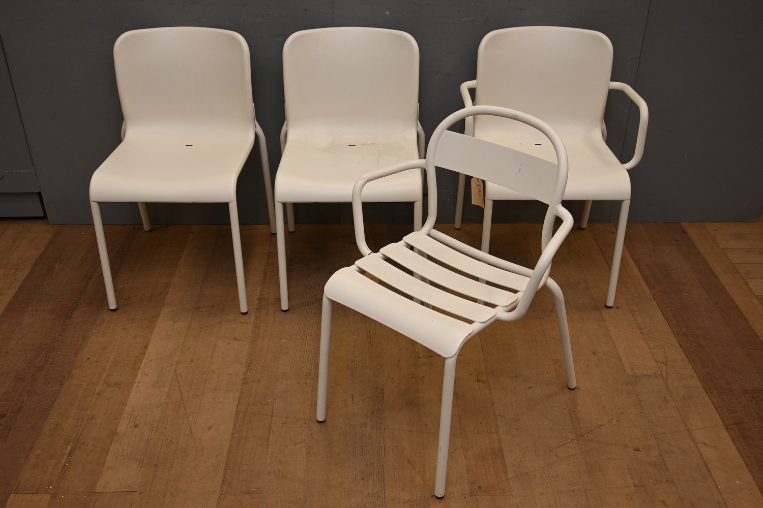 A SET OF FOUR CONTEMPORARY POWDER COATED OUTDOOR CHAIRS FOR 'COLOS' DESIGN (32H x 60W x 61D CM) (LEONARD JOEL DELIVERY SIZE: LARGE)