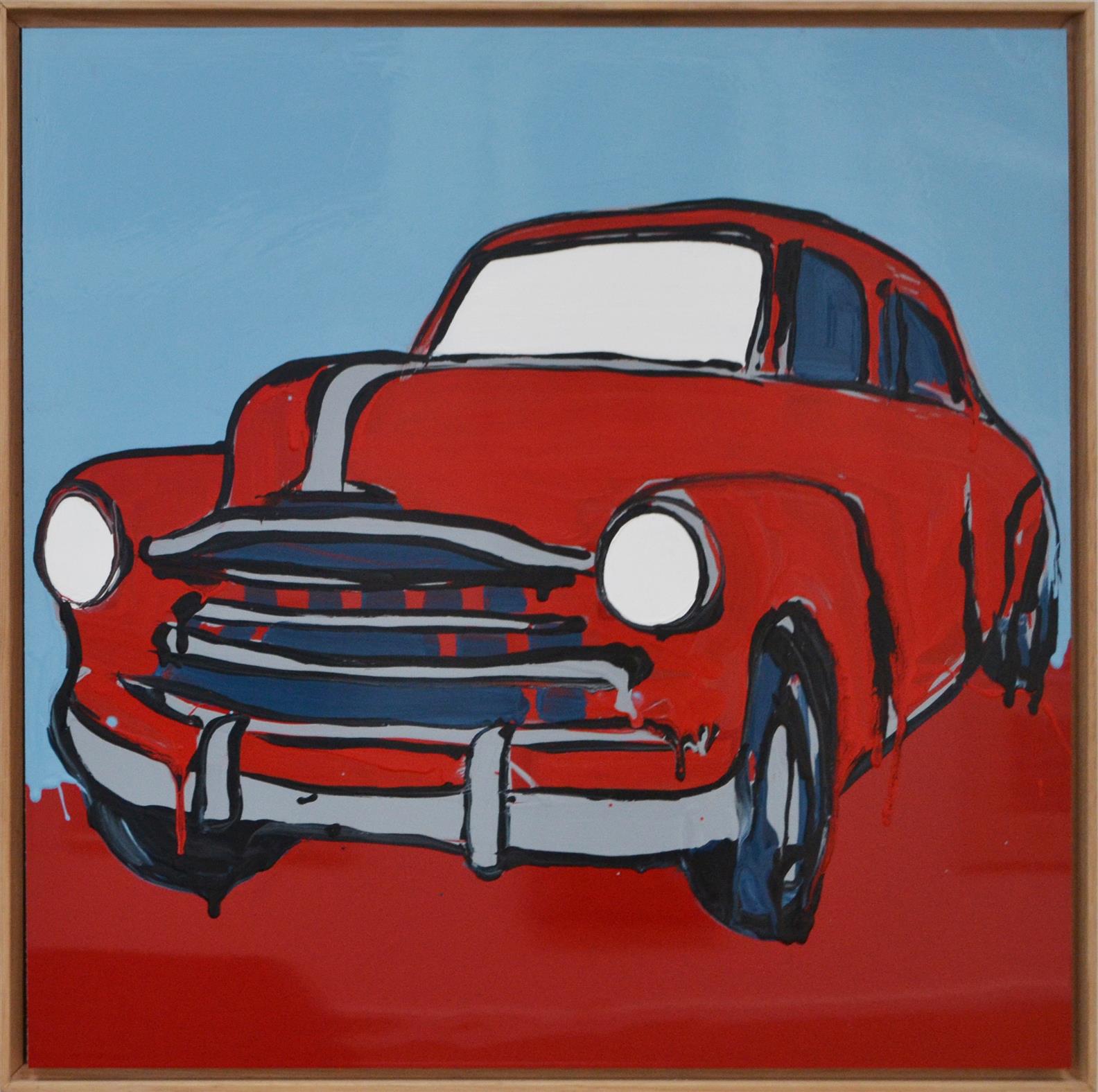 JASPER KNIGHT, CAR (RED AND BLUE), OIL ON BOARD, 59.5X 59.5CM