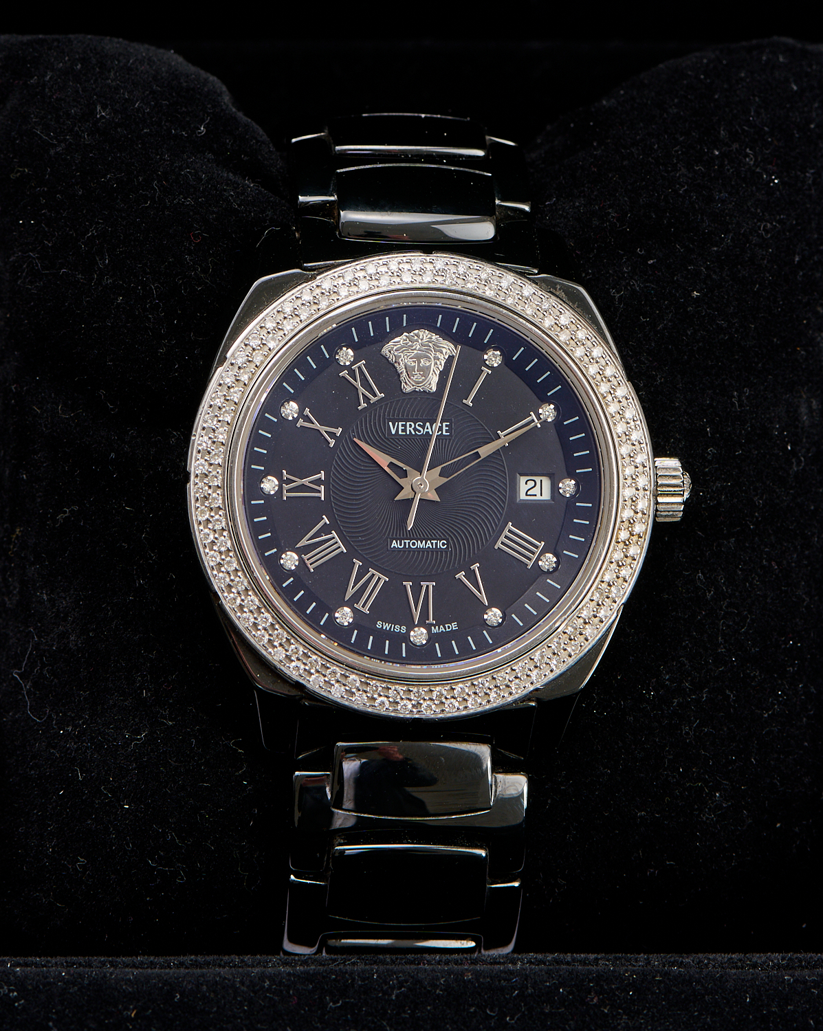 Closure: Versace black ceramic link strap and stainless steel clasp