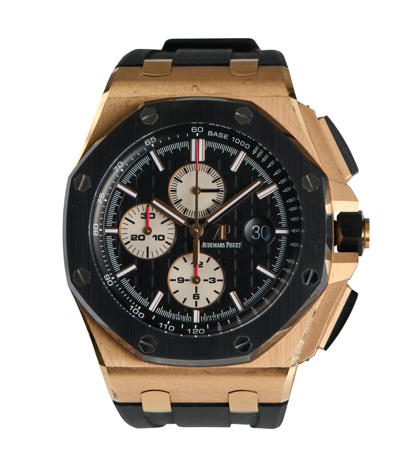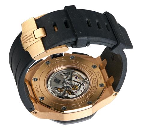 Closure: Audemars Piguet fitted black rubber tropical strap and AP 18ct pink gold buckle