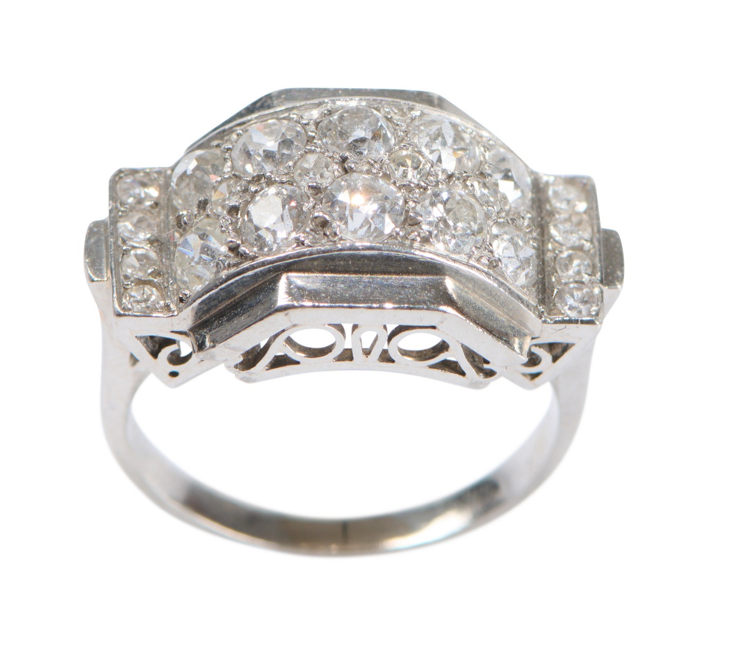 Of retro design, the wide plaque set with twenty-two old European-cut diamonds together weighing approximately 0.82 carats, ring size J.