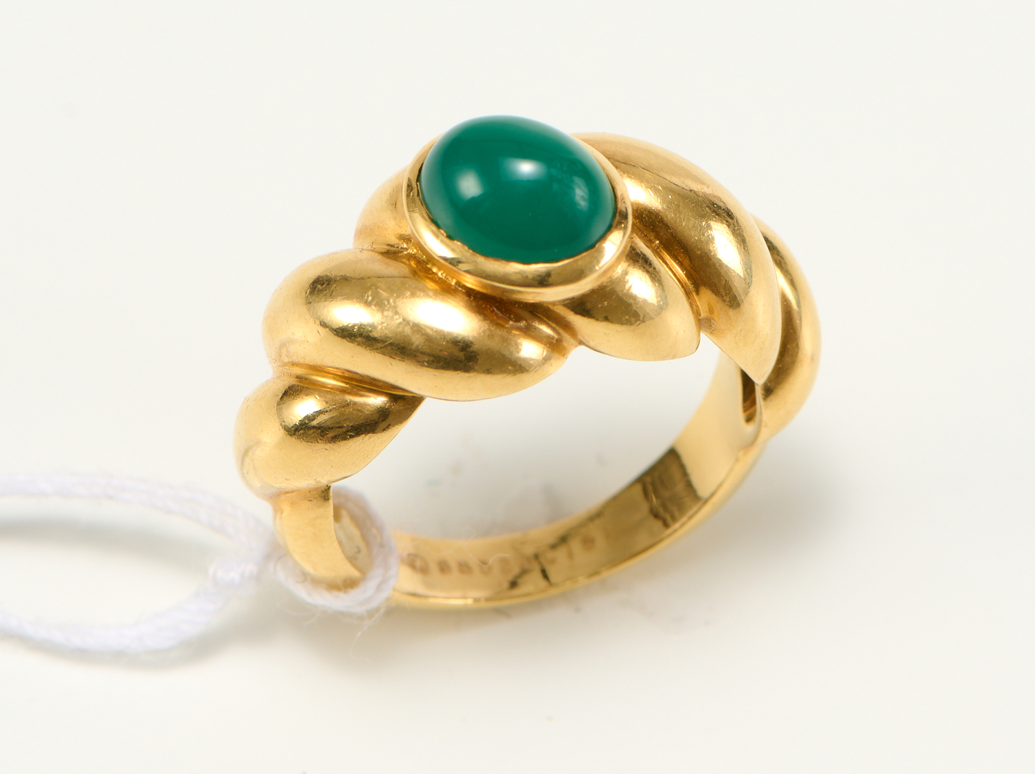 A CHALCEDONY RING IN 18CT GOLD BY VAN CLEEF & ARPELS, THE TWISTED GOLD BAND, CENTRING AN OVAL GREEN CHALCEDONY WEIGHING APPROXIMATELY 1.60 CARATS, SIGNED VCA AND NUMBERED B5520C181, RING SIZE K