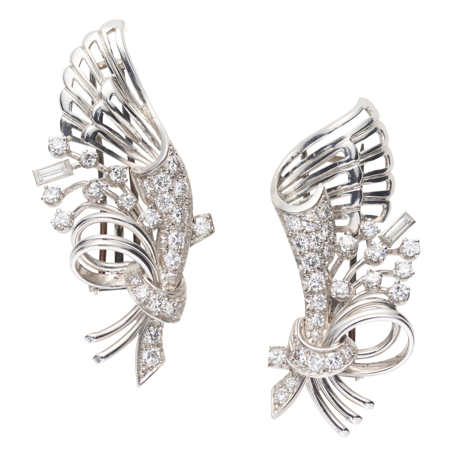 Of retro scroll design, set with round brilliant and baguette-cut diamonds together weighing approximately 0.70 carats, length 45mm each.