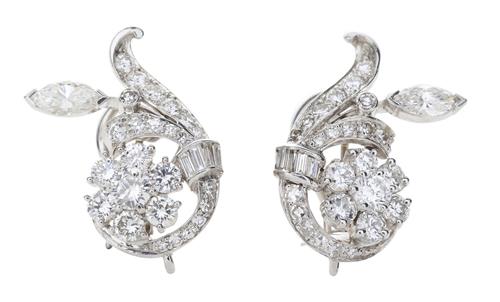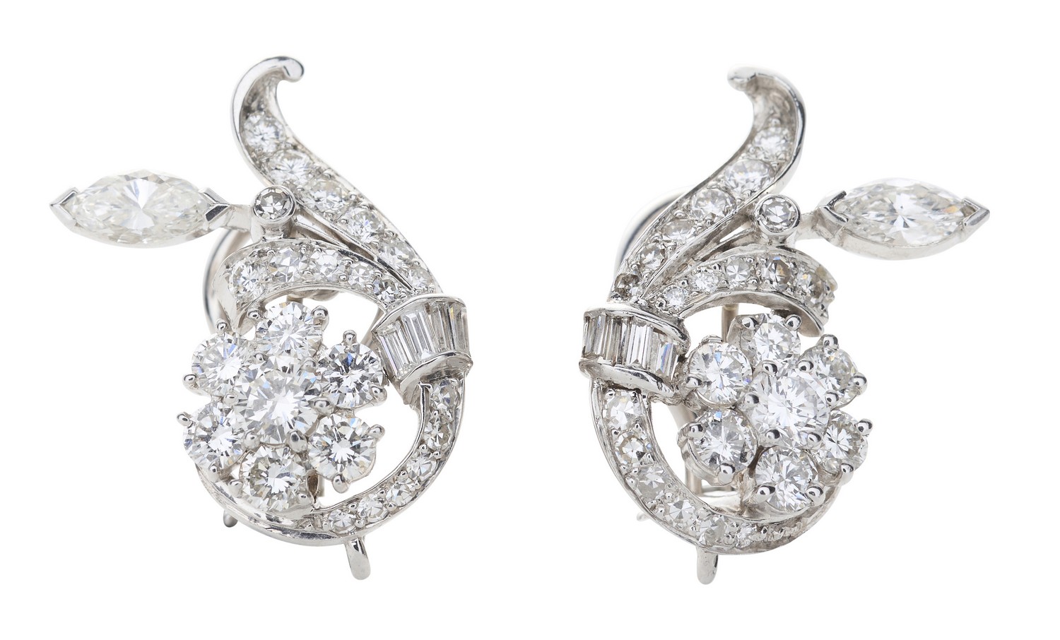 Of floral and scroll design, each earring composed of marquise, tapered baguette and round brilliant-cut diamonds together weighing approximately 1.00 carat, to clip fittings, length 24mm.