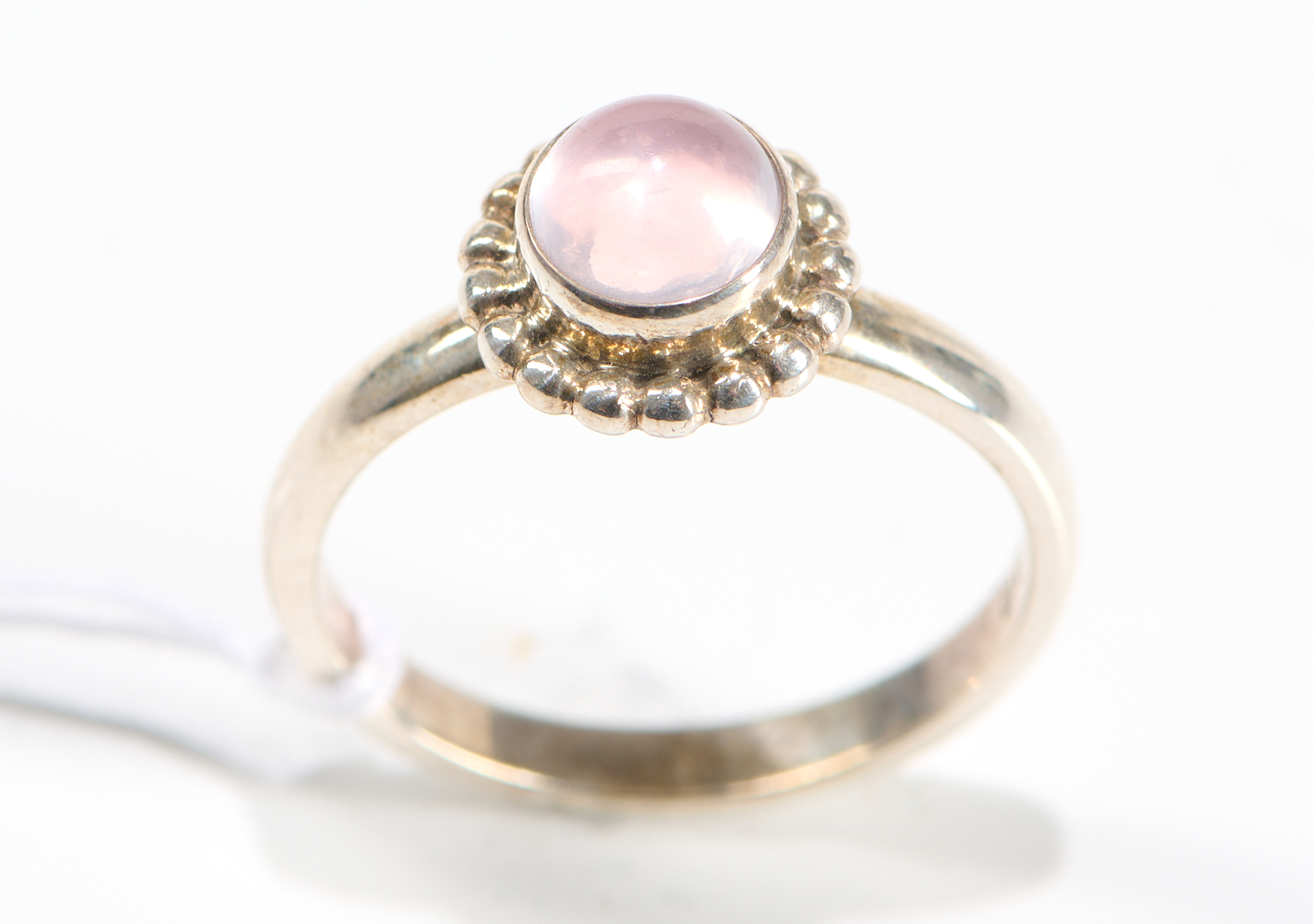 A ROSE QUARTZ AND SILVER RING BY GEORG JENSEN, REFERENCE NUMBER 9B, RING SIZE M