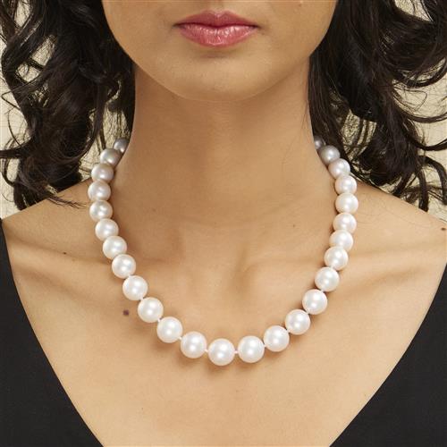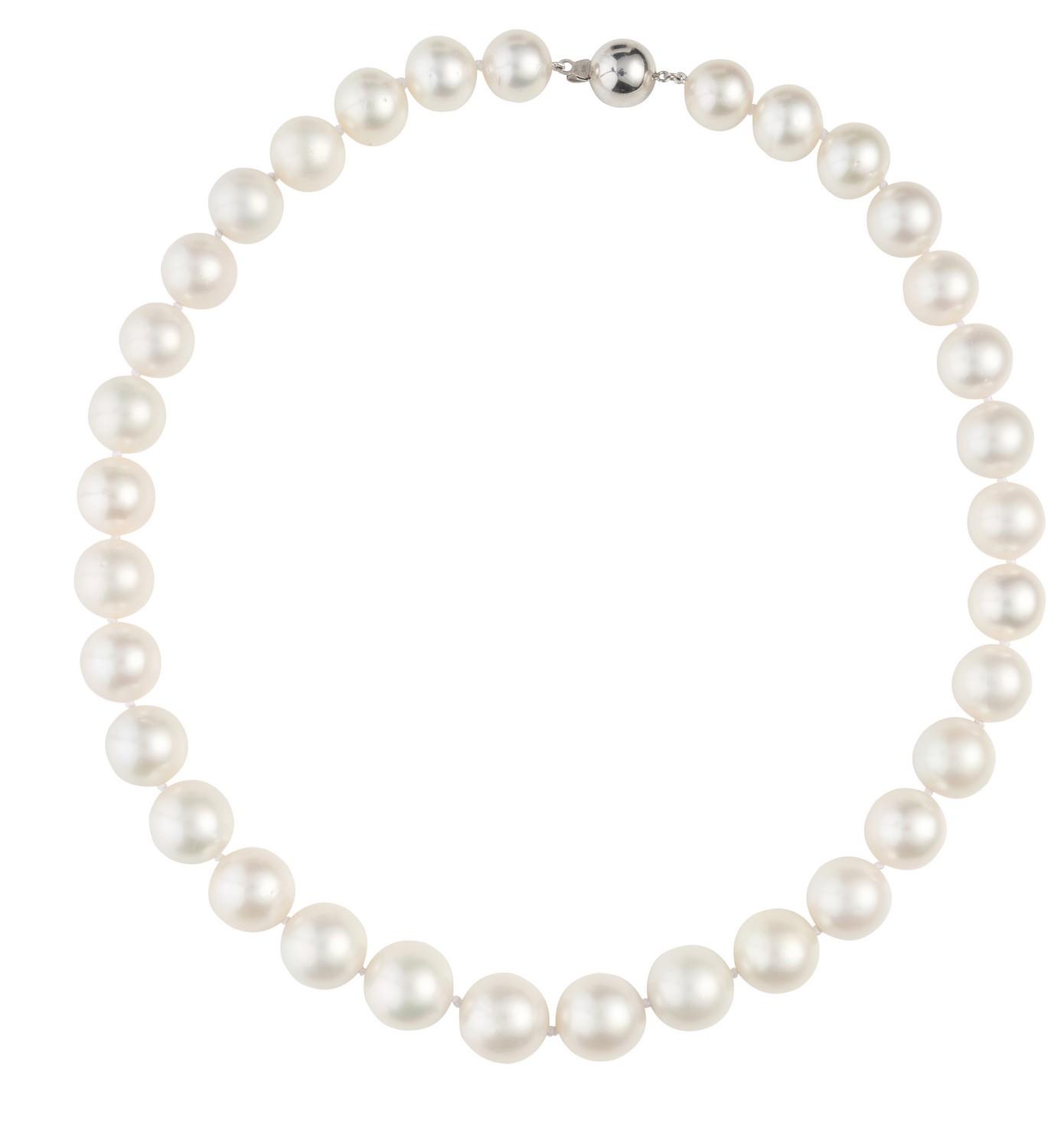 Composed of thirty-three round pearls of silver-white hues graduating from approximately 11.52mm to 14.5mm, completed by a ball clasp in 14ct white gold, length 460mm.