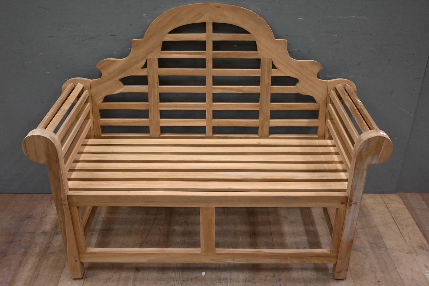 A LUTYENS TEAK BENCH SEAT ( 110H X 136W X 64D CM) (PLEASE NOTE THIS HEAVY ITEM MUST BE REMOVED BY CARRIERS AT THE CUSTOMER'S EXPENSE. LEONARD JOEL STAFF CANNOT ASSIST CARRYING THIS ITEM) (X-LARGE ITEM)
