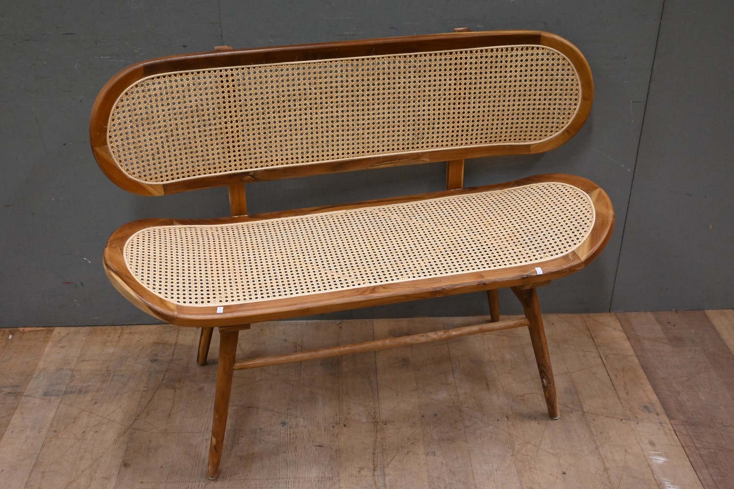 A TEAK AND RATTAN BENCH SEAT (91H X 124W X 47D CM) (LEONARD JOEL DELIVERY SIZE: LARGE)