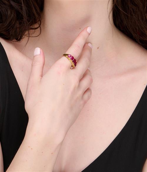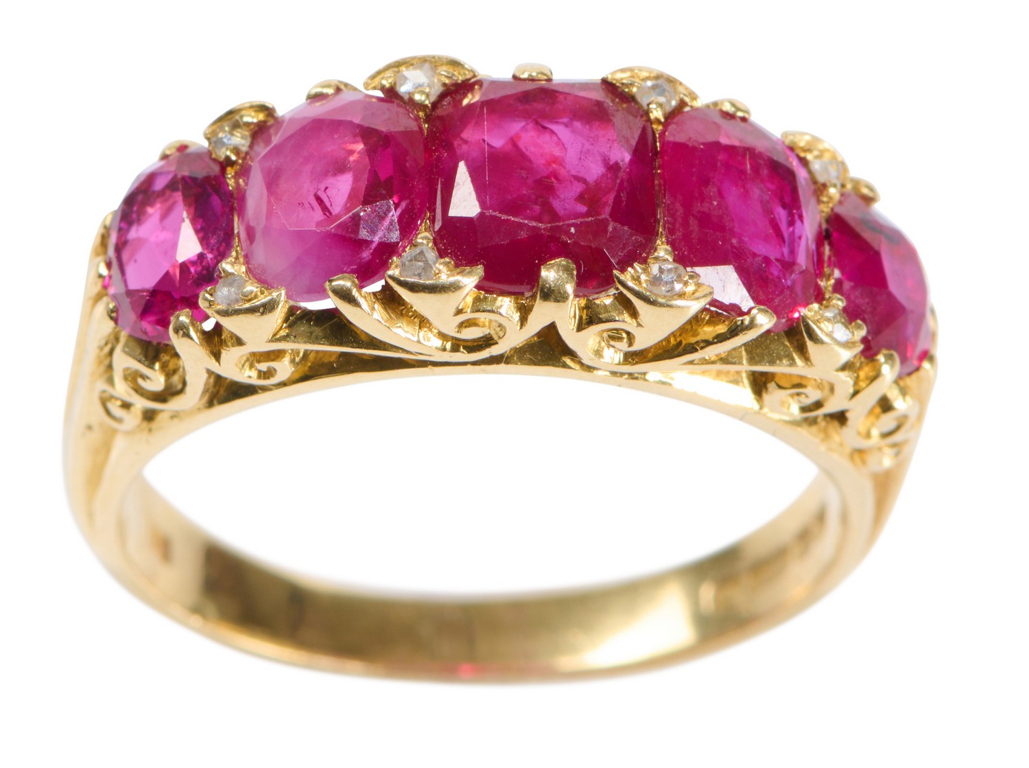 Composed of five graduating oval and old cushion-cut rubies together weighing approximately 3.70 carats, spaced by fine diamond detail, London hallmarks, ring size P.