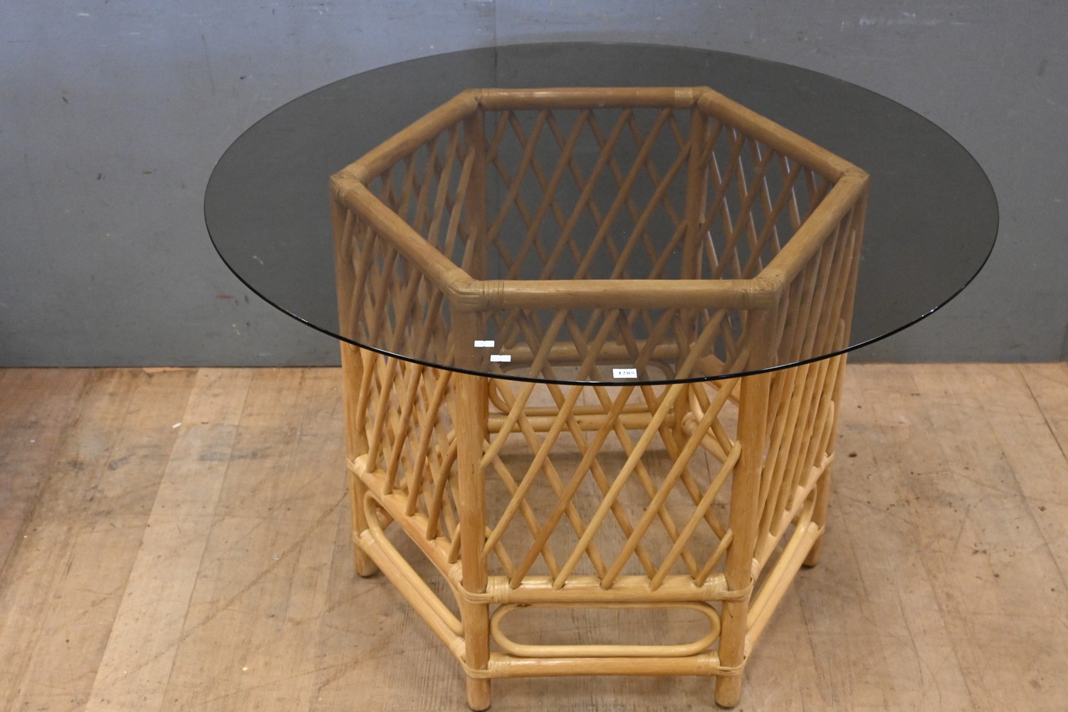 A CANE AND SMOKED GLASS TABLE (70H x 107D CM) (LEONARD JOEL DELIVERY SIZE: LARGE)