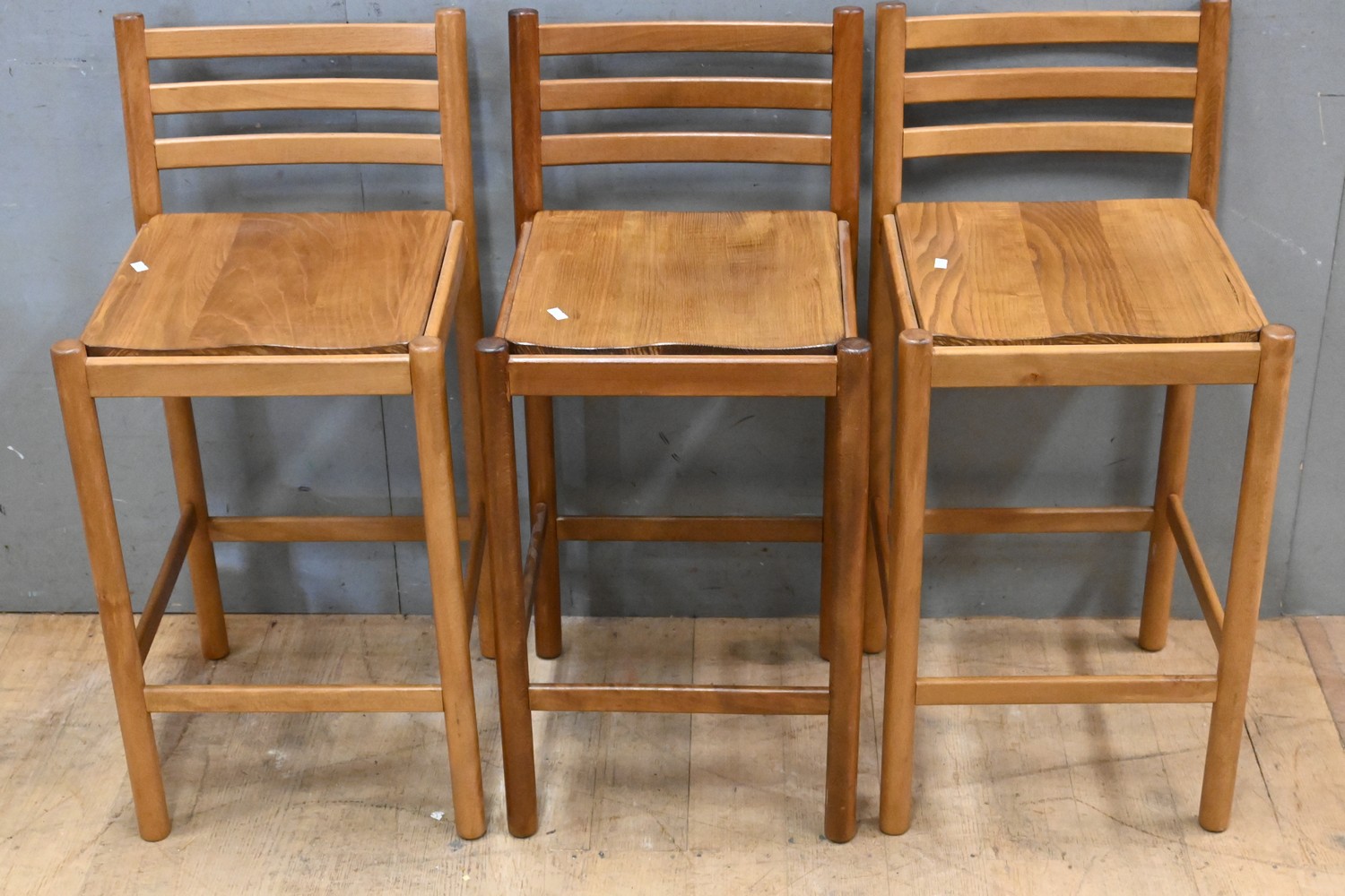 THREE MID-CENTURY STYLE BEECH STOOLS, MADE IN ITALY ( 81H X 38W X 40D CM) (LEONARD JOEL DELIVERY SIZE: LARGE)