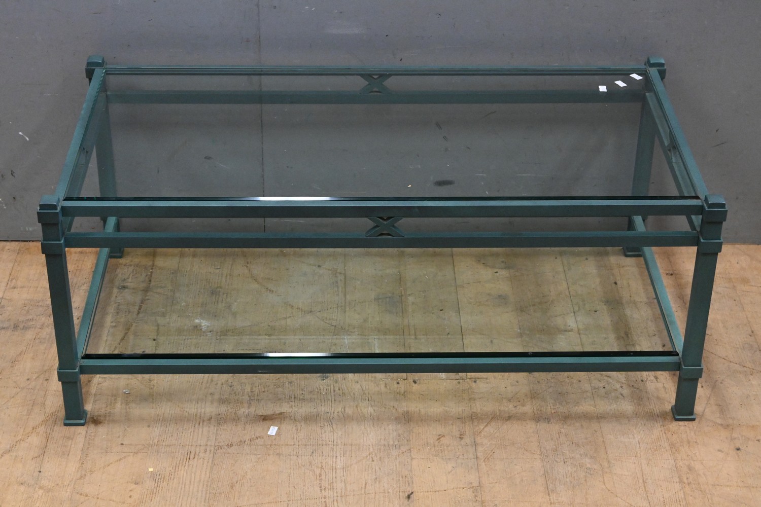 A WROUGHT IRON AND BEVELLED GLASS COFFEE TABLE (73H x 106W x 55D CM) (LEONARD JOEL DELIVERY SIZE: LARGE)